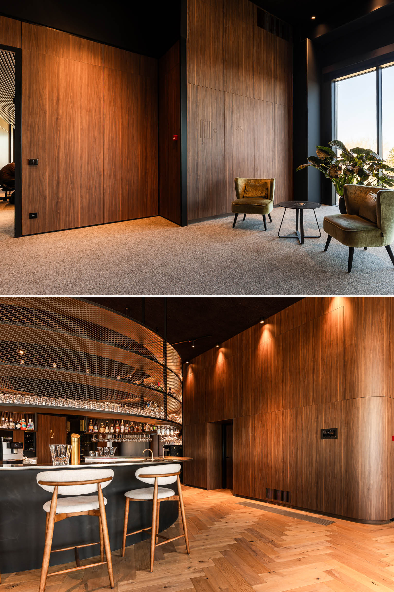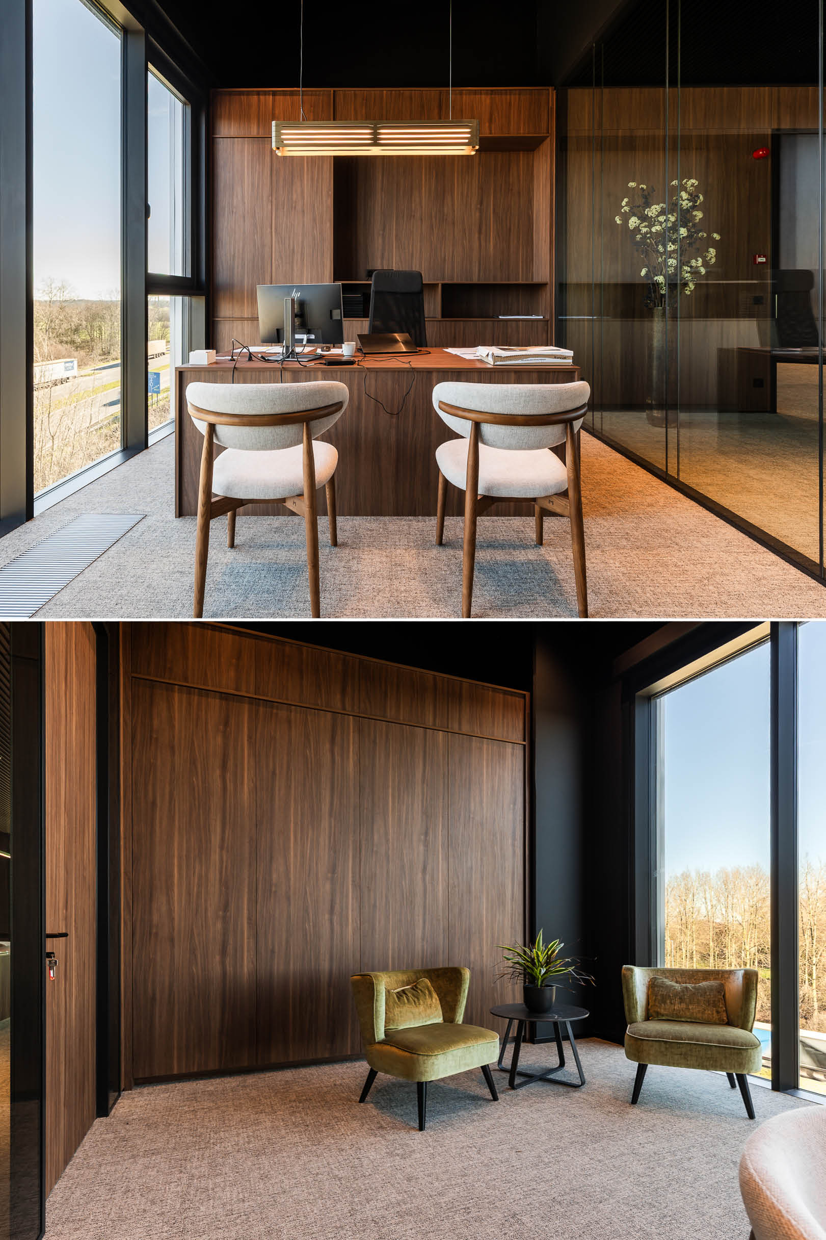 Een kantoor dat rust en klasse uitstraalt, begint bij doordacht maatwerk. Bij de nieuwe kantoren van Dakota op de Prijkels in Nazareth stond Holvoet in voor al het maatwerkmeubilair en wandbekleding. Door te kiezen voor een uniforme afwerking in zwarte melamine en HPL notelaar (Lorenzo Walnut) ontstaat een sterk en harmonieus geheel.